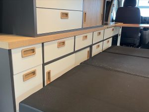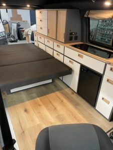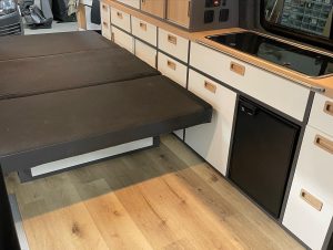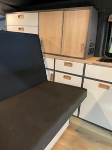 Gezamenlijk bepalen wij hoe jouw interieur eruit komt te zien. Zo maak je de keuze van kleurstellingen voor jouw stoffering, de kastenwand, vloer en van bijvoorbeeld de zittingen. Ook bepalen we de breedte van jouw slaap gedeelte en of je een meescharnierend bed wenst in het hefdak.